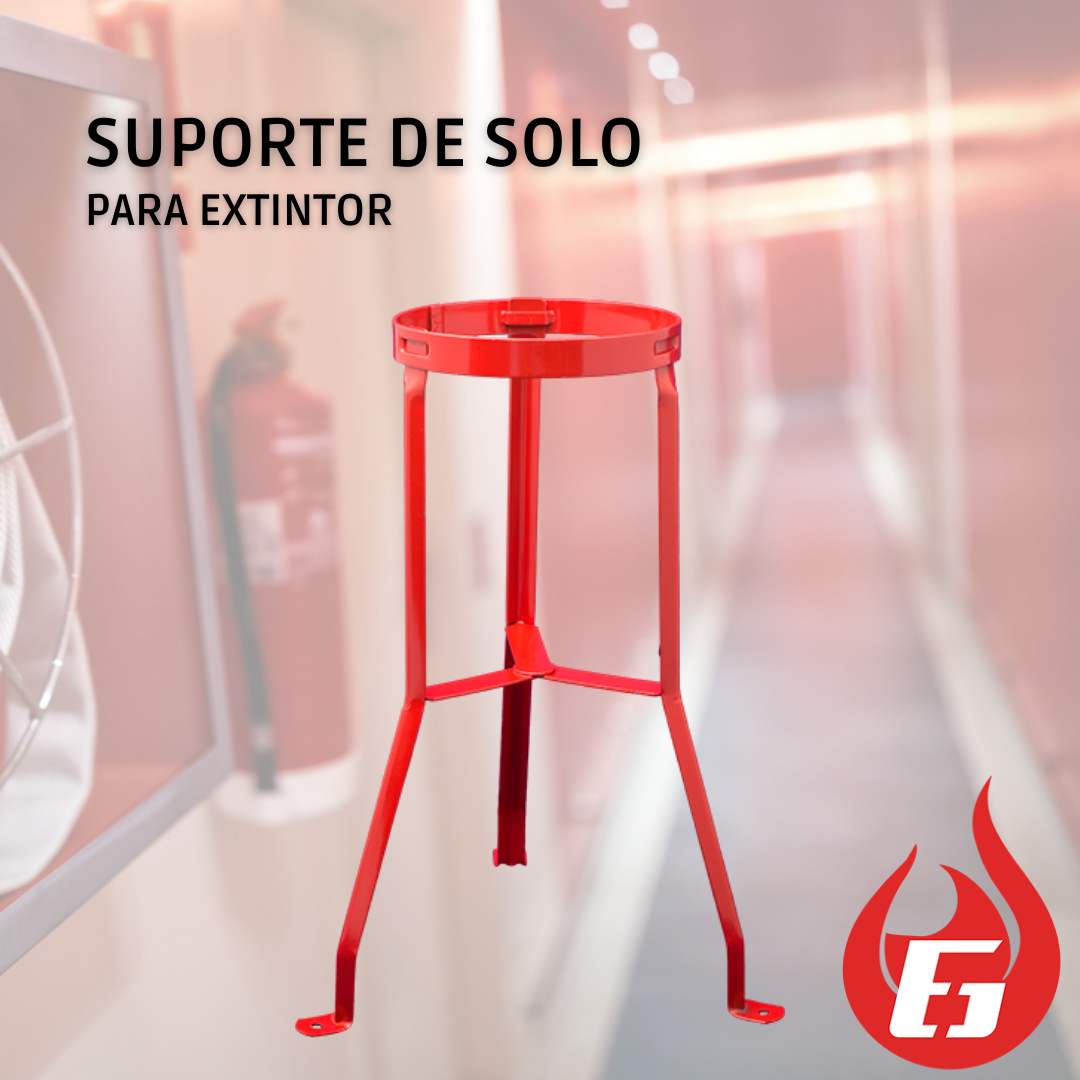 Suporte de extintor de base tripé para extintores no modelo pó químico. Fabricado em chapa de Aço, com acabamento de pintura em vermelho.